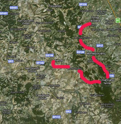Una lunga e piacevole conversazione con l'albergatore mi frutta un consiglio prezioso su come cominciare la tappa di oggi: lungo la salita iniziale, c'è una deviazione di un paio di chilometri per il borgo di Montefollonico. È un piccolo borgo medievale di grande fascino, bandiera arancione del TCI, che merita di essere conosciuto. Non si finisce mai di salire e scendere, e sarà così per tutto il giorno. Arrivo a Montepulciano verso le 11,30. Il tempo di salire in cima, ridiscendere e fare un piccolo spuntino, ed è già ora di muoversi verso Chianciano, donde parte la deviazione per La Foce. Questa volta nulla può impedirmi di compiere il giro Foce-Castelluccio-Monticchiello-Pienza, già rimandato tante volte. L'itinerario, che tra La Foce e Castelluccio presenta un pezzo di sterrato in condizioni accettabili, è molto bello soprattutto nella sua parte finale, da Monticchiello in poi. Al termine dell'ennesima salita, arrivo a Pienza poco dopo le 18,30 e qui decido che è tempo e luogo per piantare le tende. La mia bicicletta non mi consente più di alzarmi sui pedali, perché il manubrio geme orribilmente, e il movimento centrale produce dei tloc a dir poco preoccupanti. D'accordo su fatto che sia il suo ultimo ciclogiro, e lo sa anche lei, ma almeno spero che si riesca a concluderlo. Poverina, da quando il meccanico di Matelica le ha detto in faccia che è un ferraccio, ho l'impressione che si sia un po' demoralizzata.