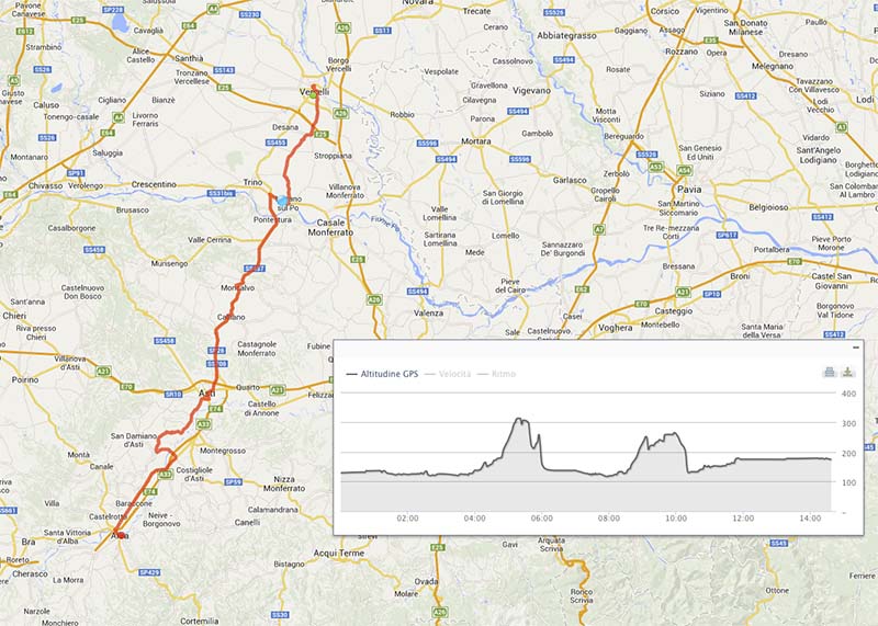 Una volta tanto le previsioni meteo erano corrette, ahimè. Quindi, pioggia fin dalla partenza, mai torrenziale, ma continua e insistente, quasi fino alle 15:30. Tuttavia la fisionomia della tappa non ne è risultata stravolta, con solo qualche piccola e non essenziale rinuncia. Dopo una breve visita alla celebre chiesa di Sant'Andrea a Vercelli, mi sono proiettato verso un percorso pianeggiante fra risaie, fino a Morano sul Po. Procedendo poi brevemente verso Chivasso, si trova la deviazione a sinistra per Moncalvo e Asti. La strada sale molto dolcemente fra piacevoli paesaggi, e solo alle viste di Moncalvo si inerpica decisamente, con un ultimo strappo al 9%. Giretto per Moncalvo, che conferma la considerazione, già maturata in passato, che questi borghi del Monferrato valgono più per la loro posizione che per sé stessi, quindi via verso Calliano e Asti. Poco dopo Calliano la pioggia si fa un po' più intensa, e c'è molto vento contro. Mi fermo per circa mezz'ora al riparo, e aggiungendo semplicemente una t riparto. Ad Asti esce il sole, e quindi decido di correre il rischio di rispettare l'ultima parte dell'itinerario programmato, con passaggi per Antignano e San Martino Alfieri lungo un percorso collinare gradevole ma non entusiasmante. Sempre meglio della statale di fondo valle. La parte più bella è la discesa a valle da San Martino, fra vigneti, quella più brutta la quindicina abbondante di km che mi separano da Alba, ove il mio percorso odierno tramonta.
