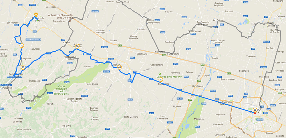 Dopo una passeggiata per il centro di Fiorenzuola, che avevo sempre brutalmente e ingiustamente ignorato nonostante l'avessi sfiorato in passato decine e decine di volte, ho seguito fiduciosamente l'itinerario programmato per stradine e sentieri, ma anche attraverso campi e vigneti, finché sono arrivato a Castell'Arquato, borgo meraviglioso. Qui però il cielo ha cominciato a coprirsi, e io mi sono fermato per uno spuntino - era quasi mezzogiorno - sperando di far coincidere la pausa con il passaggio del temporale. Invece al primo temporale ne sono seguiti, a catena, molti altri, fin quasi all'ora di cena. Mai visto nulla del genere nella mia vita. Ovviamente l'itinerario previsto è stato stravolto, e ho dovuto anche percorrere alcuni tratti della famigerata via Emilia, allagata, in compagnia di numerosi camion. D'altronde se avessi atteso la fine delle precipitazioni sarei arrivato a Parma a notte fonda. Ho dovuto così accettare un finale di tappa in umido, quasi un affogato, le cui conseguenze pagherò nelle due settimane successive in forma di mal di schiena. Parma di notte è uno splendore. Tappa numero 5: FIORENZUOLA D'ARDA (PC) - PARMA Lunghezza: 63,3 km - Dislivello: 295 m Andatura media: 13,98 kmh - Temperatura media: 25,4 Punti d'interesse: la campagna fra Fiorenzuola e Castell'Arquato, Castell'Arquato, Castelguelfo, Parma di notte (non si tema, è bella anche di giorno, naturalmente) Gradimento: *** (nonostante tutto) Difficoltà: * NOTE: il maltempo mi ha negato le visite di Vigoleno e dei numerosi castelli della bassa parmense. La traccia originale è segnata in grigio sulla cartina qui sopra. |